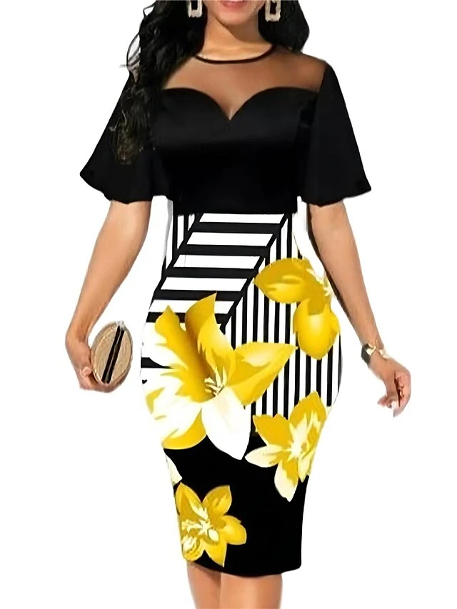 Women’s Work Dress Sheath Dress Semi Formal Dress Fashion Midi Dress Lace Mesh Crew Neck Short Sleeve Floral Stripe Slim Yellow Summer Spring S M L XL XXL