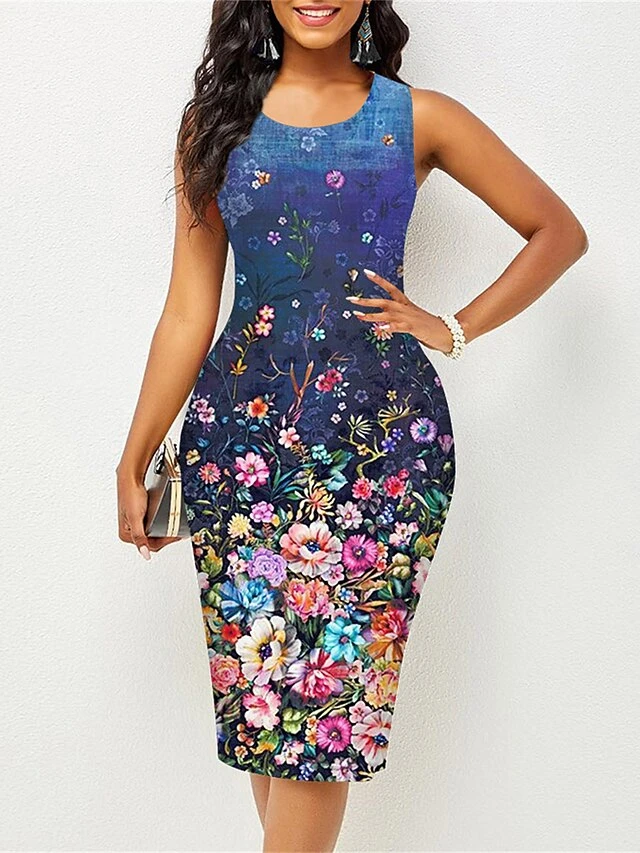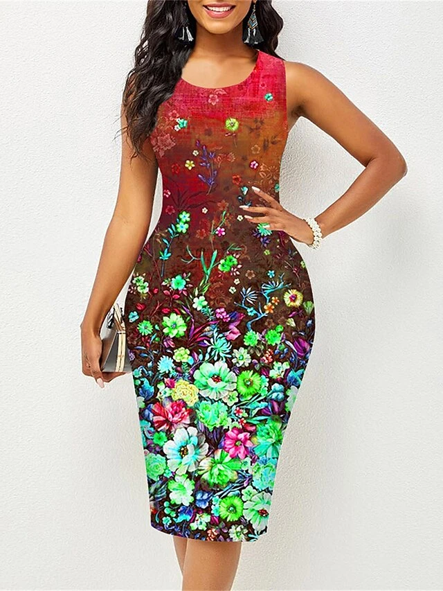 Women’s Work Dress Sheath Dress Semi Formal Dress Fashion Midi Dress Print Crew Neck Sleeveless Floral Slim Pink Red Blue Summer Spring S M L XL XXL