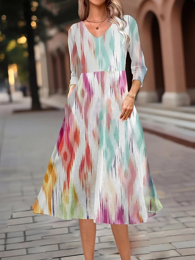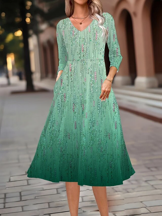 Women’s Work Dress Swing Dress A Line Dress Fashion Midi Dress Pocket Print V Neck 3/4 Length Sleeve Floral Geometric Regular Fit White Blue Green Fall Winter S M L XL XXL